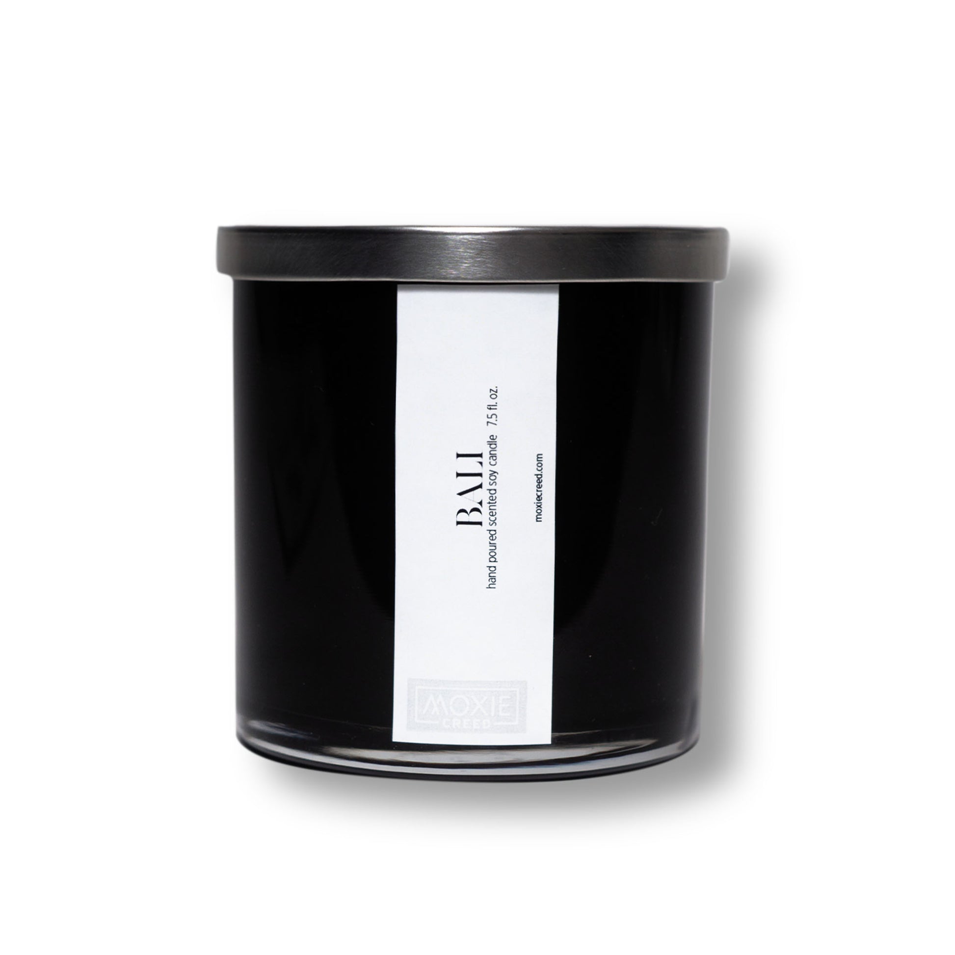 - Minimalist black glass packaging includes a silver metal lid.