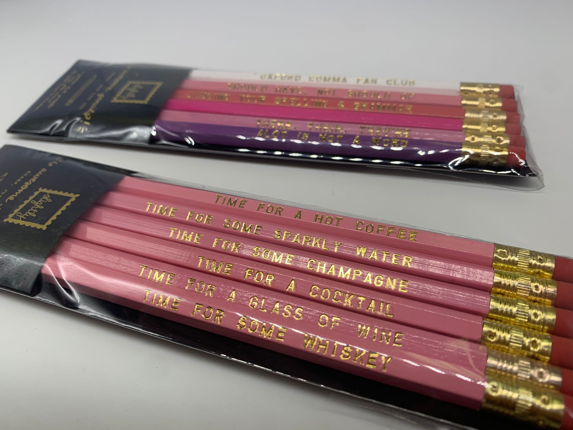 Made in the USA #2 hex pencils gold foil imprint each pack contains 6 pencils Pencils in the ‘Time for a Drink’ pack are all light pink and read: